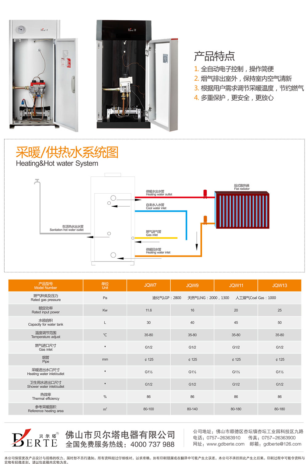 產品型號:JQW*-E1可滿足功率:7kW、9 kW、11 kW 產品特點:• 全自動電子控制,操作簡便;• 煙氣排出室外,保持室內空氣清新;• 根據用戶需求調節(jié)采暖溫度,節(jié)約燃氣;• 多重保護,更安全,更放心。